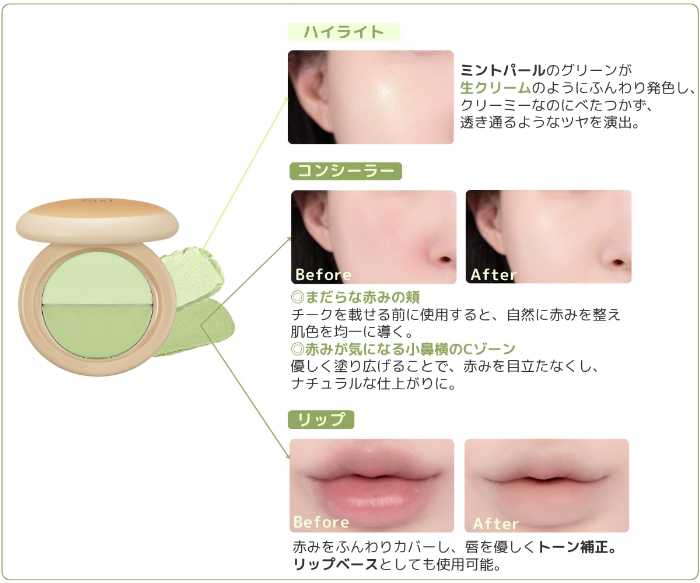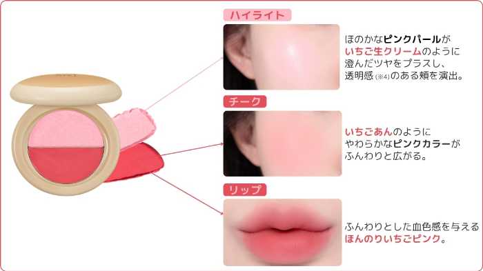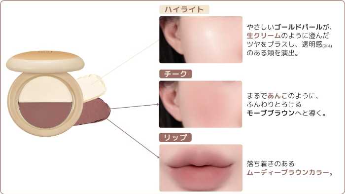 01「あんこブラウン」、02「スイートいちご」はハイライト・チーク・リップの3WAY仕様。03「クリーミー抹茶」はハイライター・コンシーラー・リップとして使える優れものです。