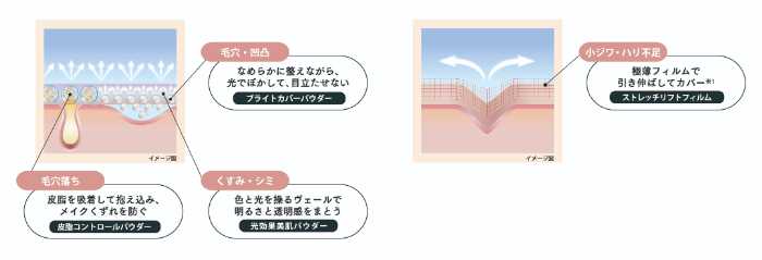 毛穴やシミをカバーする「ブライトカバーパウダー」、皮脂を抑える「皮脂コントロールパウダー」、血色感を演出する「光効果美肌パウダー」の3種類のパウダーを配合し、メイクアップ効果でワントーン明るい肌に導きます。