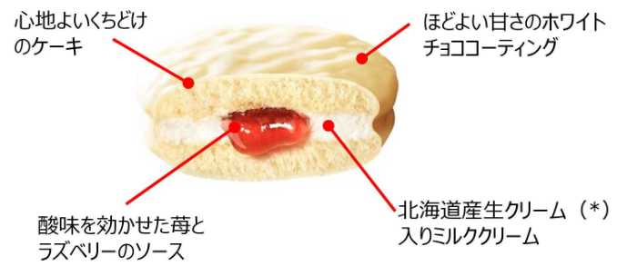 ケーキ生地は心地よいくちどけに改良され、卵とバニラの風味が豊かに香ります。中には北海道産生クリーム入りのミルククリームと、苺・ラズベリーを使ったダブルベリーソースをサンド。