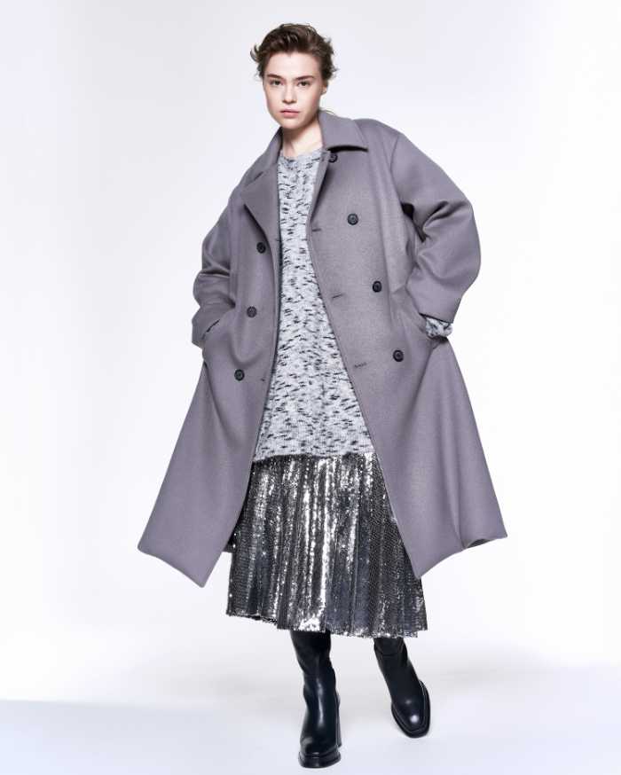 クラシックなダブルブレストのロングコート(132,000円)は、上品な襟元とすっきりとしたラインで凛とした印象に。