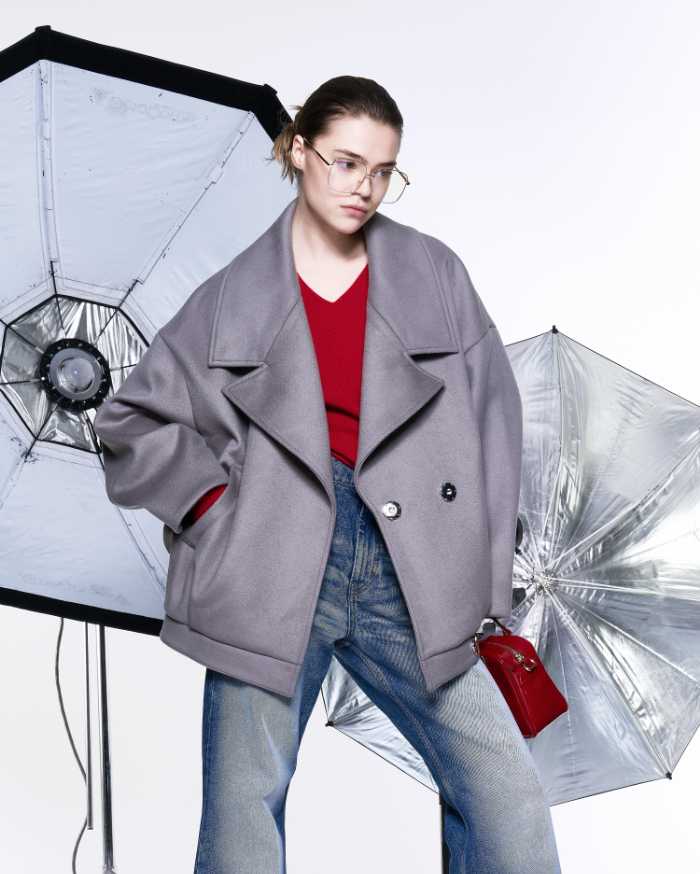 ショートブルゾン(96,800円)はビッグカラーとコクーンシルエットが特徴で、パンツにもスカートにも合わせやすいバランスが魅力。