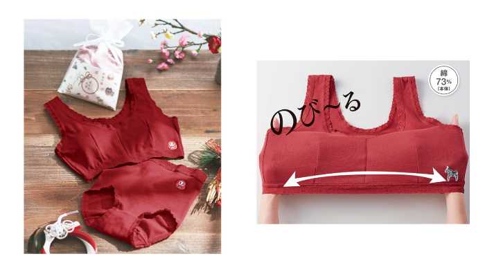 注目は、「新年の幸せを願う」ソフトブラ(ノンワイヤー・フルカップ)。S〜3Lサイズで展開され、カラーはレッド(ウマ)、ベージュ(だるま)、セットA(だるま)の3種類。