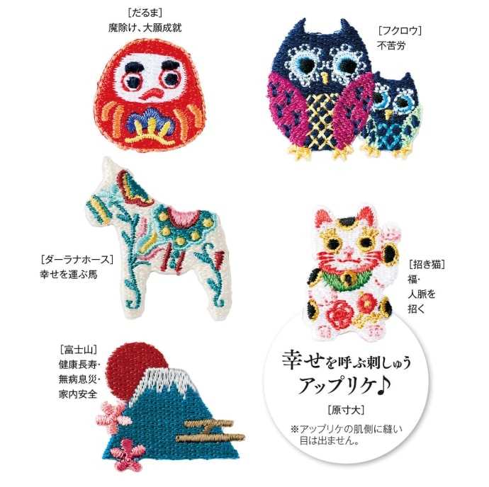 幸運を呼ぶアップリケを自由に貼れる「新年の幸せを願う アップリケ3点セット」(1,639円)は、ウマ・だるま・フクロウなどをモチーフにした可愛いデザイン。