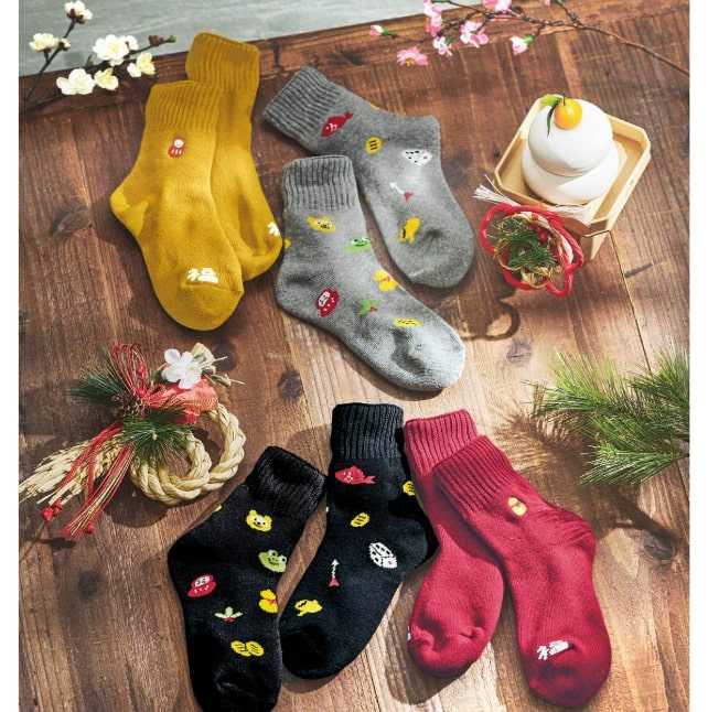 「開運招福ソックス・色柄違い2足組」(1,639円)は、10種類の縁起モチーフが散りばめられた新年らしいデザイン。パイル仕様でふかふかの履き心地が魅力です。