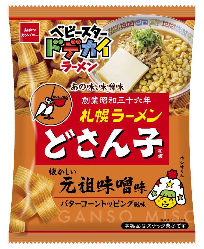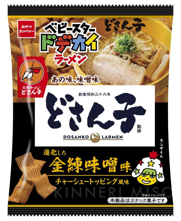 11月10日(月)より、全国のスーパーマーケットなどで販売開始の「ベビースタードデカイラーメン(札幌ラーメン どさん子監修)」2種は、元祖味噌味バターコーン風味と金練味噌味チャーシュートッピング風味。