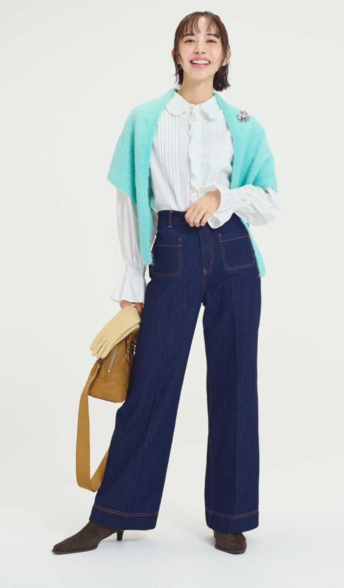「パッチポケットデザインシガレットデニムパンツ」(¥9,900税込)は、ハイウエストとフロントポケットで洗練された印象に。ヴィンテージムードも漂う大人のデニムです。