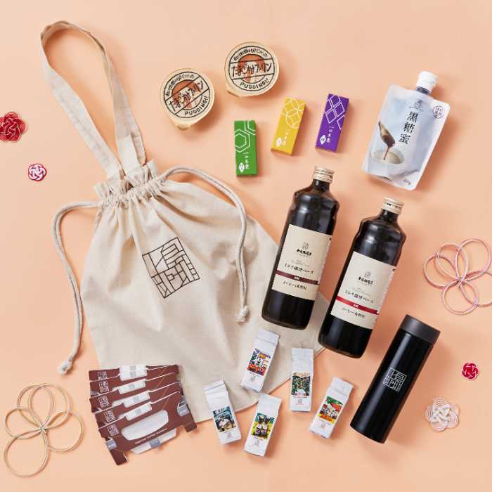 上島珈琲店のブレンドやミルク珈琲ベース、黒糖蜜、ひとくち羊羹、プリンまで揃ったセットは、6,000円(税込)で真空ボトル&巾着トート付き♡