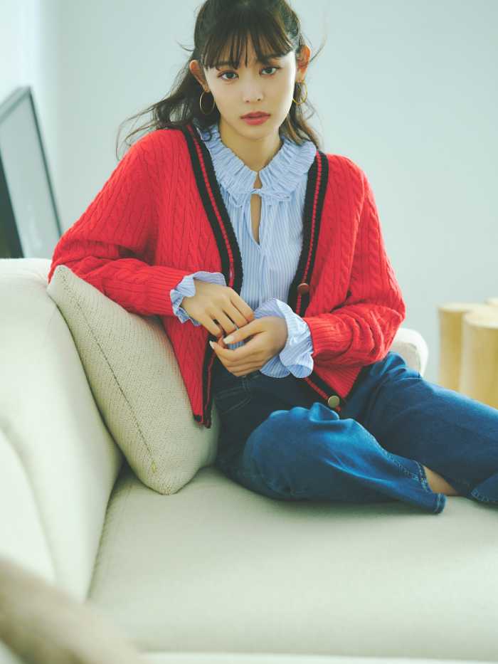 パールがきらめく衿つきニット(17,600円)や、赤×デニムの相思相愛コーデ(カーディガン18,700円/ブラウス16,500円/パンツ20,900円)など、トレンド感あふれるラインアップ。