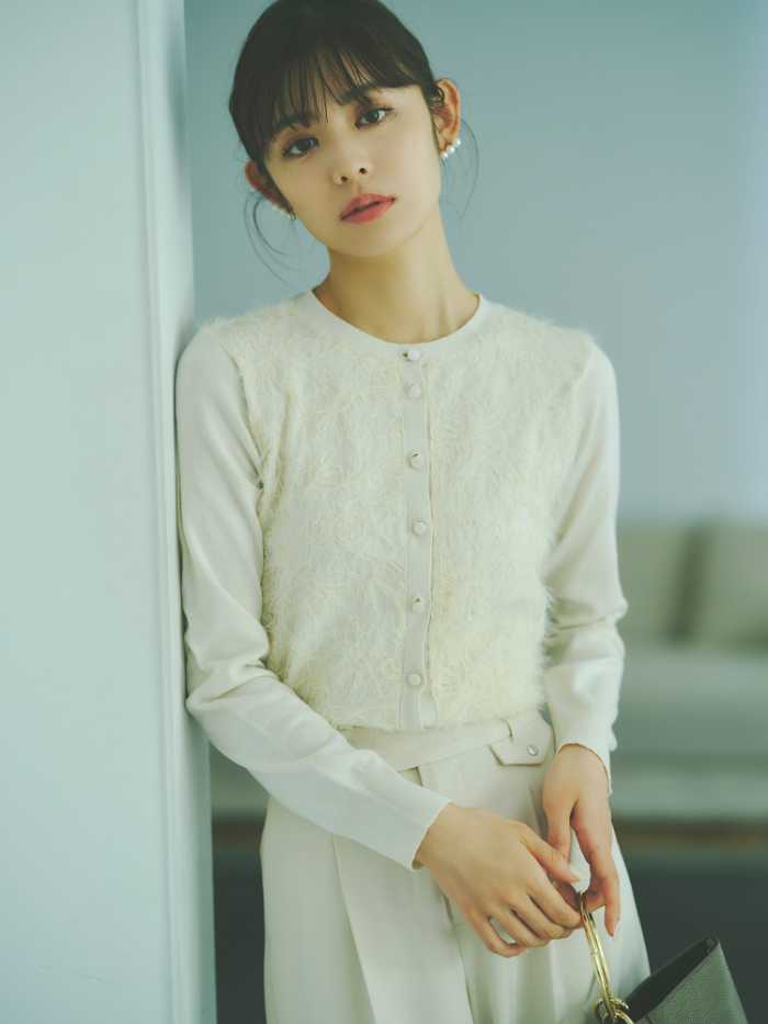 Stola.の魅力は、女性らしいシルエットと上質な素材使い。フリルカラーのニットレイヤード(カーディガン19,800円/ブラウス17,600円/パンツ19,800円)や、刺繍カーディガン(17,600円)など、繊細なディテールが光るデザインがラインアップ。
