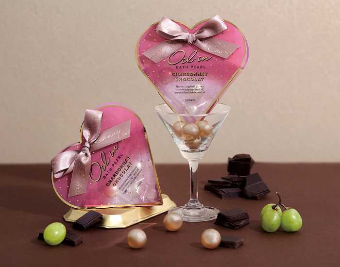 まるでパールのように輝く新作「オイルインバスパール(ハート)」が登場。湯船に浮かべると、シャルドネショコラのやさしい香りと保湿オイルが溶け出し、しっとりとしたお湯に包まれます。