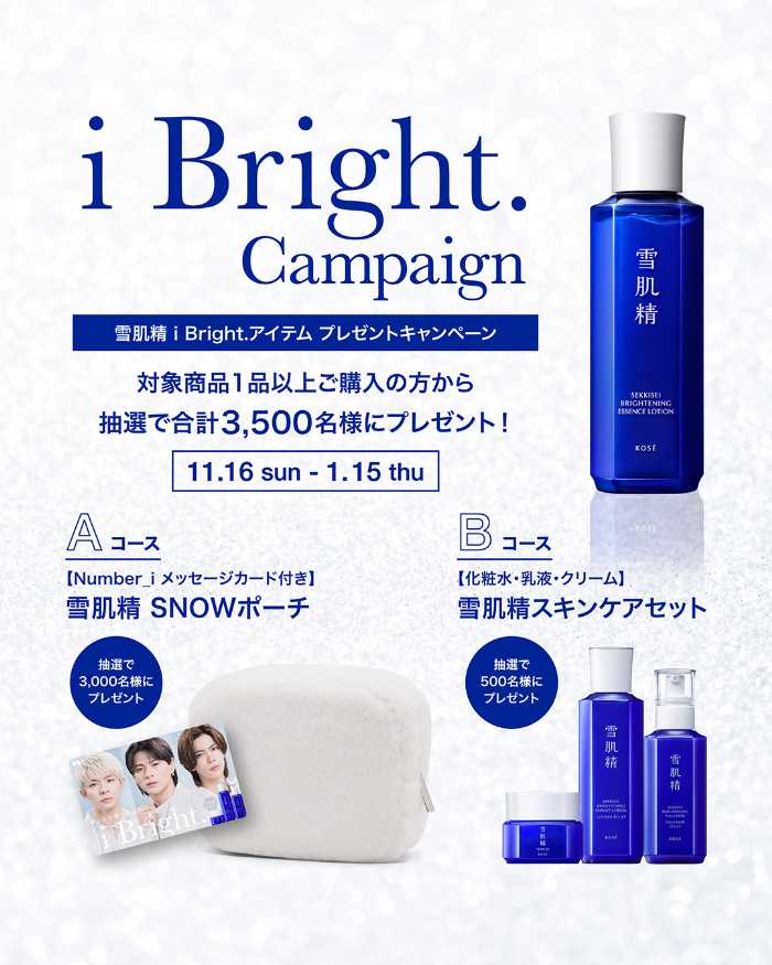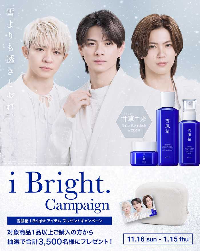 新CM公開を記念して、抽選で合計3,500名様に『雪肌精 i Bright.アイテム』が当たるキャンペーンを実施中。対象商品を1品以上購入し、専用応募フォームから応募可能です。