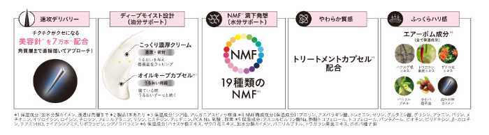 ※7 NMF構成成分(保湿成分):プロリン、アスパラギン酸、トレオニン、セリン、グルタミン酸、グリシン、 アラニン、バリン、メチオニン、イソロイシン、ロイシン、チロシン、フェニルアラニン、リシン、ヒスチジン、アルギニン、PCA-Na、乳酸、尿素