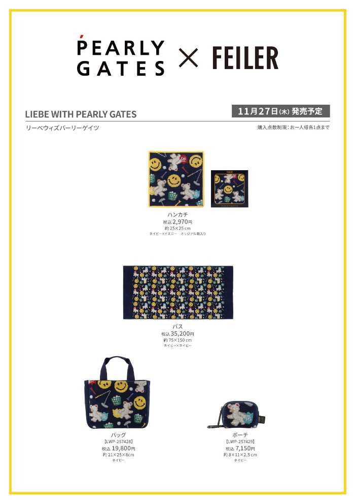 ドイツ伝統のシュニール織で知られる「FEILER(フェイラー)」と、人気ゴルフアパレルブランド「PEARLY GATES(パーリーゲイツ)」の夢のコラボが実現!11月27日(木)より、『LIEBE WITH PEARLY GATES』の限定アイテムが登場です。フェイラーのリーベくんとパーリーゲイツのPGニコちゃんが並ぶ遊び心いっぱいのデザイン♡ハンカチからバッグまで、全4アイテムをラインアップ。