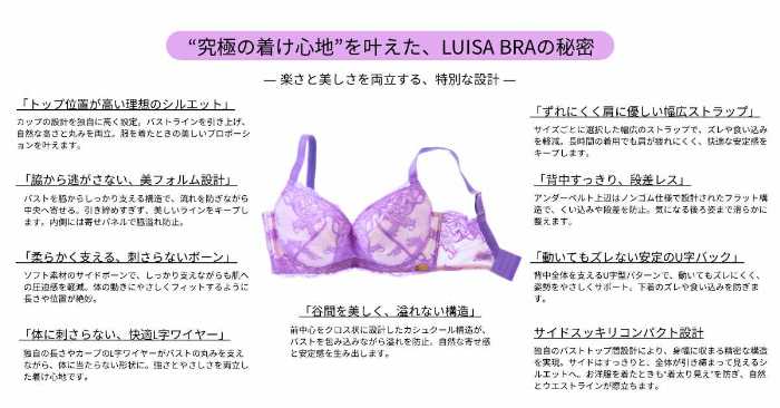 LUISAシリーズは、脇から逃がさない立体設計、柔らかく支える刺さらないボーン、快適L字ワイヤーなどを採用。