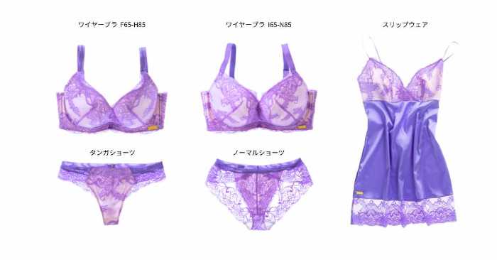 F65〜N85の全45サイズで展開し、ブラジャー32,500円〜35,500円、ショーツ15,400円、スリップ44,000円(税込)。