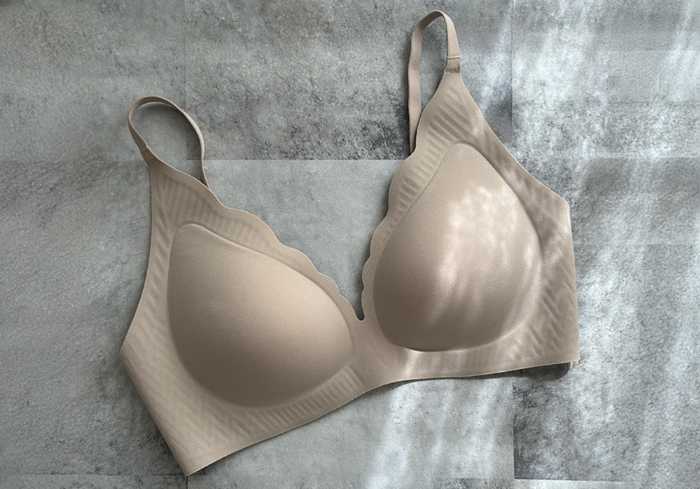 Brariaの“お肌のごちそう下着”は、ノンワイヤーながらもバストをやさしく包み込む360°伸縮構造が特徴。