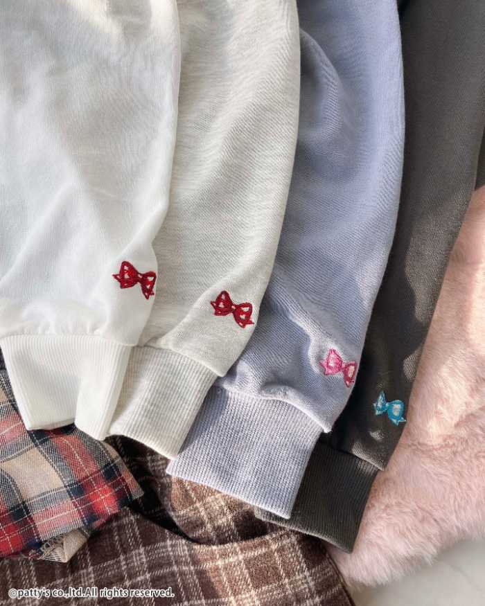 胸元にはリボンをまとったキュートなアート、袖にはリボンのワンポイント刺繍が施され、どの角度から見ても“かわいい”があふれます。