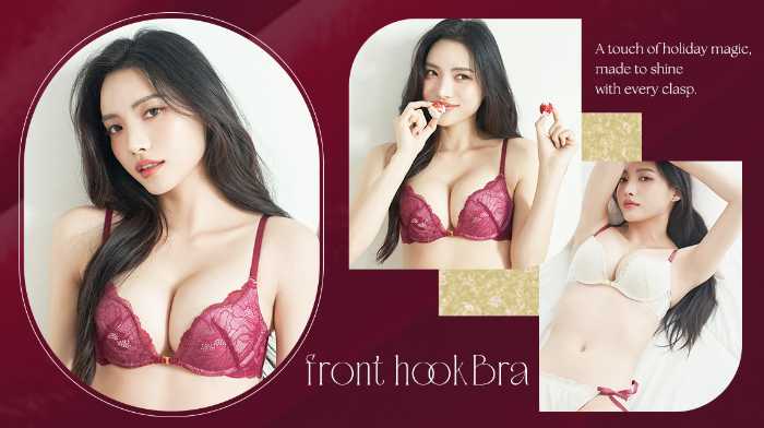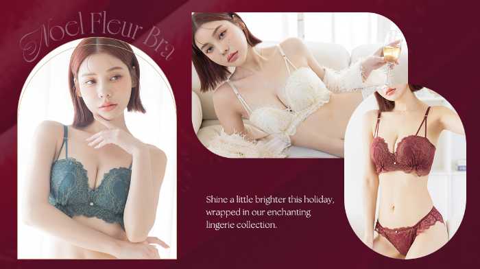 ホリデーシーズンにぴったりな「ピオニーレースフロントホックブラ&ショーツ」(¥4,380〜)が登場。華やかなワインレッドカラーとリボン装飾が、大人の女性らしさを引き立てます。