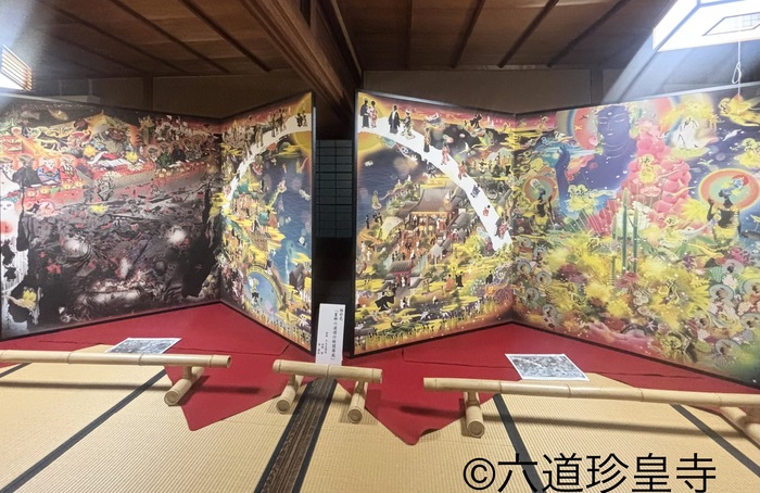 京都の絵描きユニット、「だるま商店」から奉納された「極彩色篁卿六道遊行絵図屏風」、色鮮やかな色彩で、見たこともない、あの世の世界観が、今にも動きだしそうなリアリティと、どことなく、不思議な奇妙さに、煌びやかさ、妖艶さを感じさせる作品です。「だるま商店」と「六道珍皇寺」との出会いも、偶然による、人と人との縁で結ばれ、こちらの絵を奉納していただいたそうです。