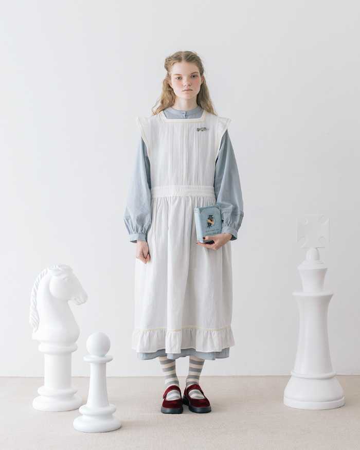 『鏡の国のアリス』に登場するエプロンをモチーフにした「配色エプロンワンピース」(¥8,690)は、ベロアリボンが冬らしいクラシカルな印象を演出。