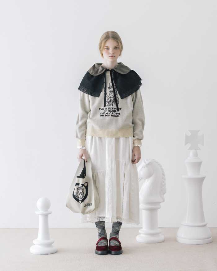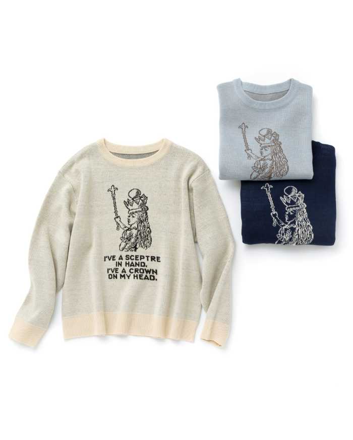 チェスの女王となったアリスを織りで描いたニットには、どこか誇らしげなムードが漂います。