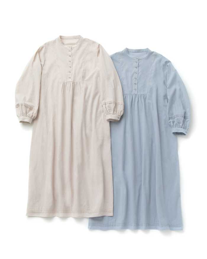 スタンドネックの「裾タックワンピース」(¥8,690)は、袖や裾にピンタックをあしらい、Samansa Mos2らしい優しさをプラス。2着を重ねれば、まるで物語の中に迷い込んだような気分に。