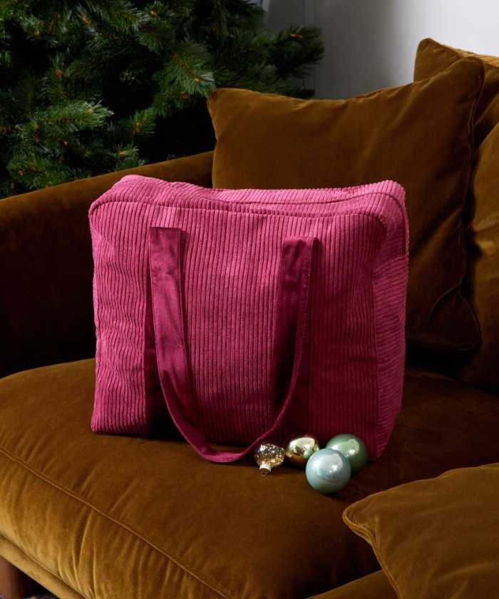 トートバッグは、リサイクル素材100%で、表地は光沢コーデュロイ、裏地にはオレンジタータンチェックをあしらったこだわり仕様。