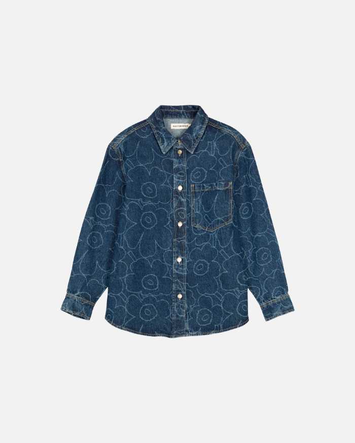 大胆でアーティスティックな「Piirto Unikko」モチーフを全面にプリントしたデニムシャツ「Piirto Unikko Vaihe デニムシャツ」は、個性を引き立てながらも上品な印象に。