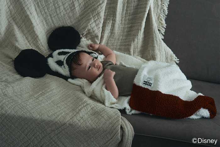 「hooded blanket / Mickey」(¥10,450税込)は、フードをかぶればまるでミッキー♡抱っこ紐やベビーバギーに装着可能なテープ付きで毎日大活躍です。