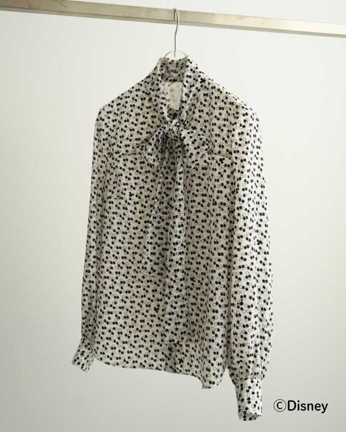 やわらかなデシン素材に隠れミッキー&ミニーが散りばめられたブラウス。取り外し可能なボウタイ付きで、多彩なアレンジが可能。