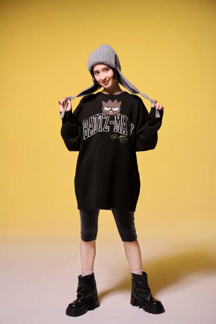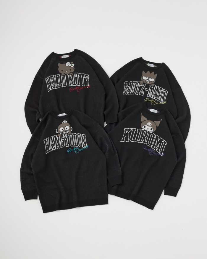 ハローキティ、ハンギョドン、バッドばつ丸、クロミがジャガードや刺繍など多彩な技法で表現され、ほどよい遊び心とスタイリッシュさを両立しています。