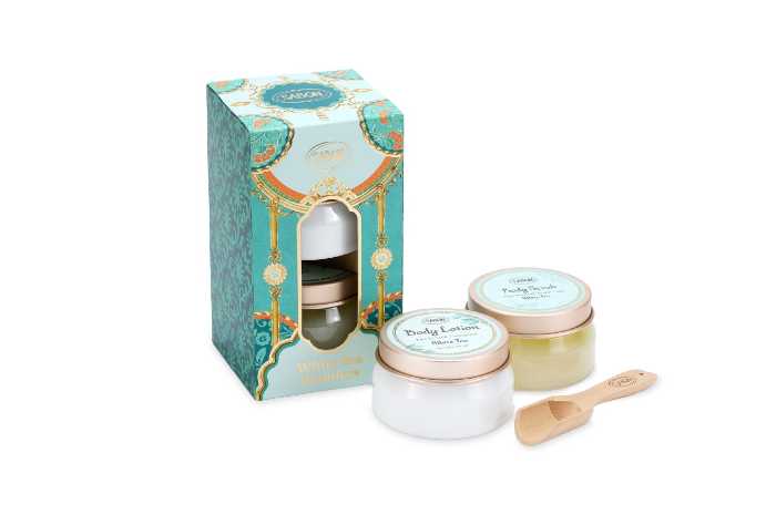 落ち着いた香りが好きな方には、ホワイトティーの香りを堪能できるボディケアデュオ ホワイトティー(税込5,940円)**もおすすめです。どちらもスプーン付きで、使うたびに優雅な気分に♡