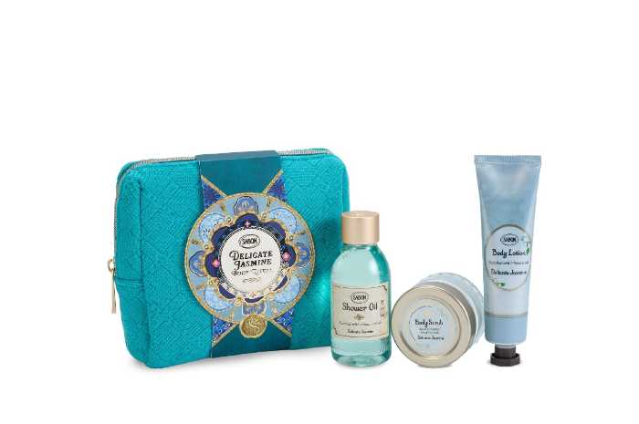 また、より華やかな香りを求める方には、シャワーオイル100mL・ボディスクラブ60g・ボディローション50mLにポーチが付いたロイヤルギフト デリケート・ジャスミン(税込4,950円)**も登場。
