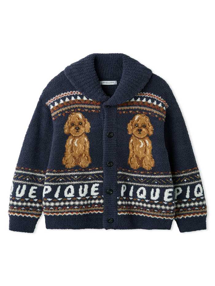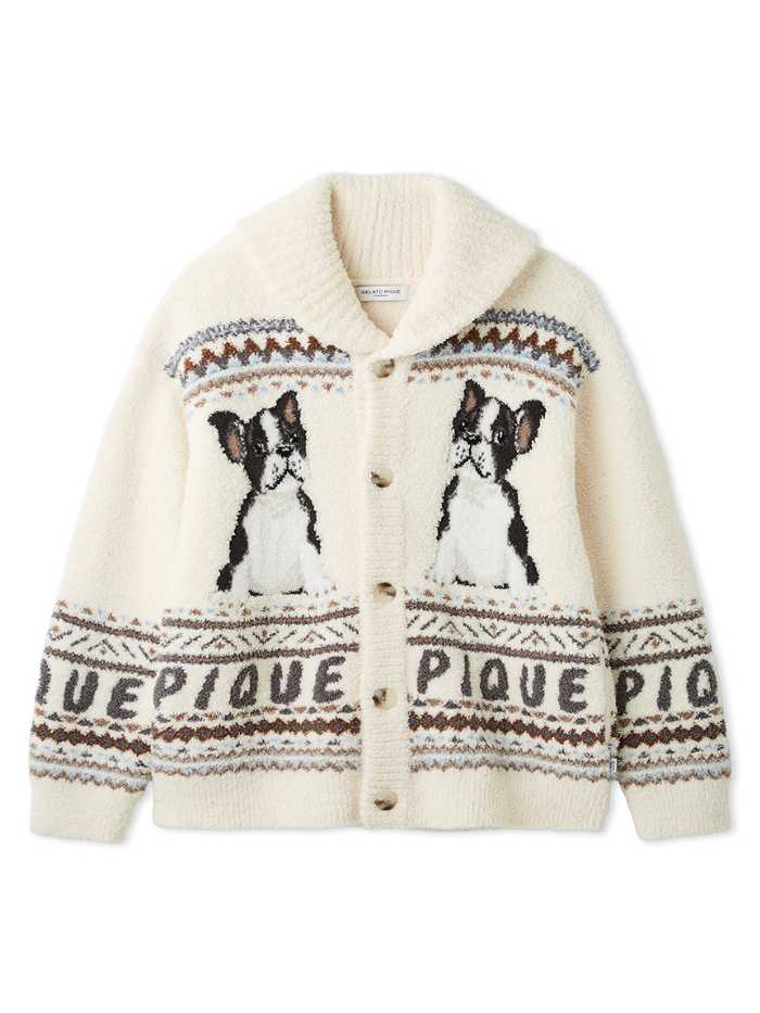 ジャガードで描かれたベアモチーフとボリュームのあるショールカラーが特徴で、胸元にはロゴのサガラ刺繍が添えられています。