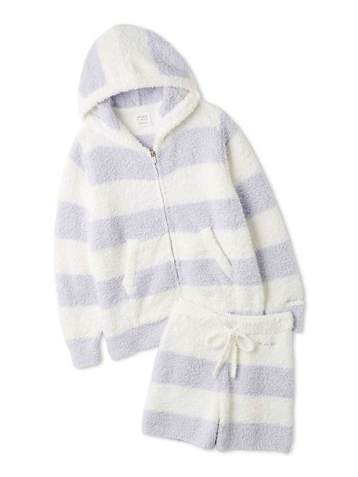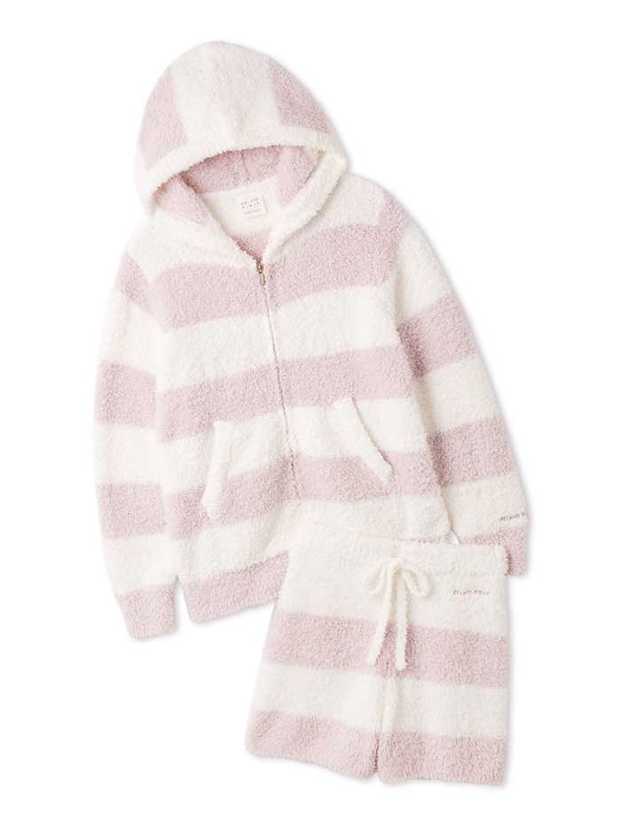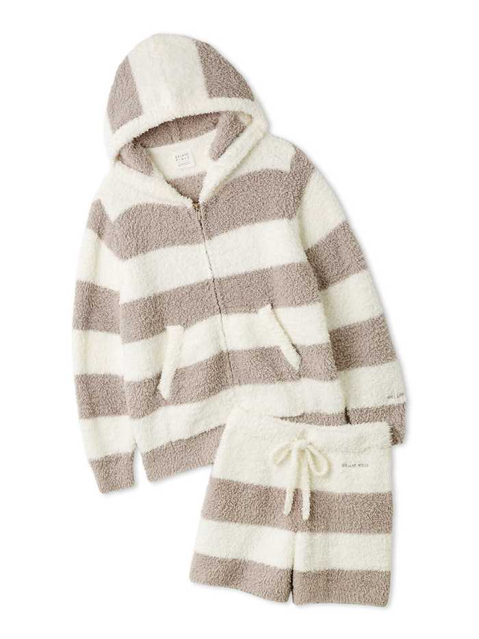 アイボリーとチャコールグレーの2色で、アーチロゴのトップスと細ボーダーのパンツが大人のシンプル感を演出します。