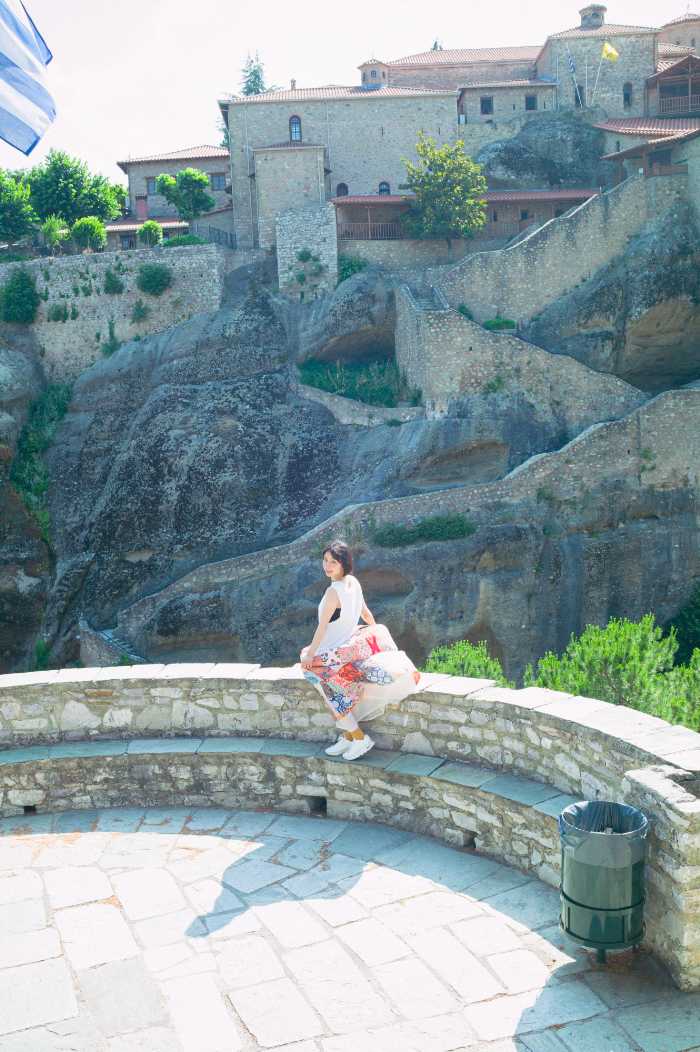 さらに、巨大な岩山に建つメガロ・メテオロン修道院を背景にしたカットでは、風になびくスカートが映える圧巻のショットも。