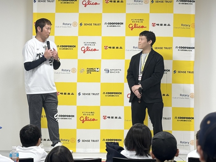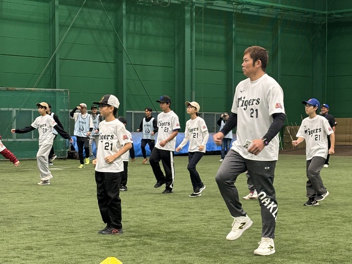 打撃や守備の練習では、低学年〜高学年の2チームに分かれて、野球のプロから直接指導を受けるという夢のような体験!この日のイベントでは、指導役の先生として、来季から2軍投手コーチとなる桑原謙太朗アカデミーコーチも参加されました。