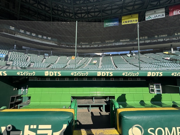 ベンチからは、広々とした阪神甲子園球場を見渡すパノラマ