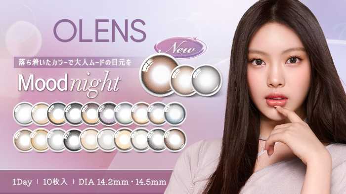 OLENSシリーズは全14シリーズ・計40色を展開。レンズは1dayタイプで、BC8.7mm、DIA14.5mm(リアリッシュ)、DIA14.2mm(その他シリーズ)、含水率は38.5%。