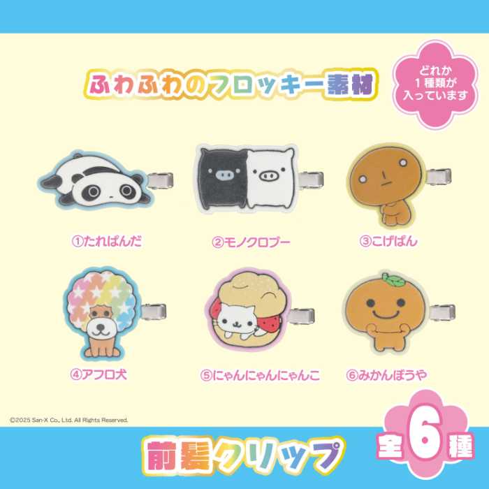 ラインナップは、「たれぱんだ」「こげぱん」「アフロ犬」「モノクロブー」「にゃんにゃんにゃんこ」「みかんぼうや」の全6種。