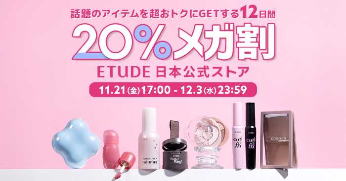 エチュードがQoo10メガ割に合わせて、日本公式ストア限定のお得なプロモーションをスタート♡新作「カールフィックスマスカラ スキニー」や、生すふれリップ「ソフトフィクシングティント」、美少女EYEを叶える「ぽよんアイメイカー」など、先行発売や限定セットが盛りだくさん!送料無料や最大40%OFFクーポンも利用できるので、この冬はお気に入りコスメをお得に手に入れるチャンスです♪