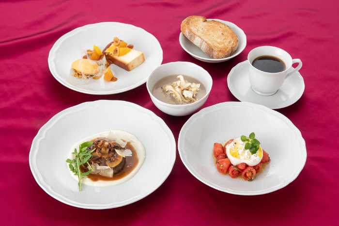東京店・品川店はサーモンマリネ、名古屋店はブラータチーズのカプレーゼが前菜。香り豊かなマッシュルームポタージュで心も体も温まります。