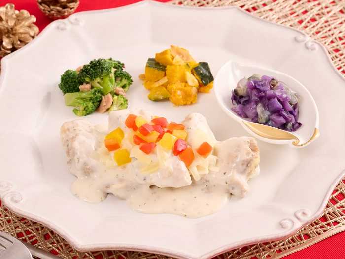 パプリカが彩りを添え、クリスマスらしい華やかさも魅力です。副菜はブロッコリーツナサラダ、かぼちゃアーモンド、アサリと紫キャベツのマリネの3種で、プレート全体が上品な味わいに整えられています。