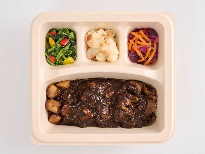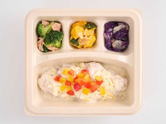 副菜にはほうれん草ソテー、カリフラワーコンソメ、人参と紫キャベツのサラダをセットし、バランスよく楽しめます。