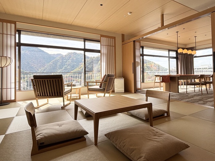 西館の最上階にある1 室限りのお部屋。窓からは、有馬温泉の景色をなんと独り占めできる景観。お食事や寛ぎの場として大人数でも利用できる専用ダイニングルームも完備しており、大きなダイニングテーブルにて、カフェタイムやお食事をみんなで囲む事ができます。