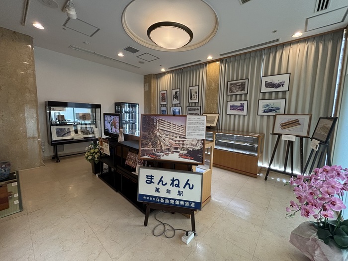 一階フロントロビー奥にあるガラス張りになった扉をあけると、無料で楽しめるギャラリーがあります。展示されているのは、兵衛旅館の時代に使用していた道具や、懐かしのテレビCMを拝見したり、兵衛向陽閣ね歴史を感じる品々をご覧いただけます。
