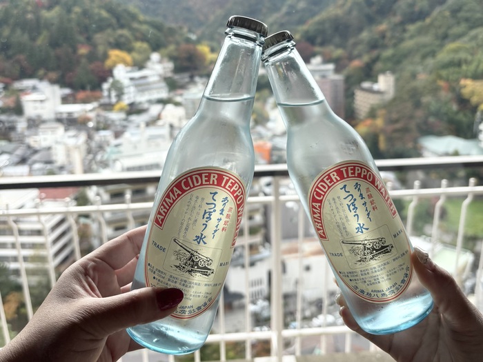 冷蔵庫のお飲み物や、コーヒーセット(コーヒー・紅茶・ココア)も全て無料サービス。素晴らしいお部屋からの景観と一緒に、ありまサイダーてっぽう水でカンパイ。
