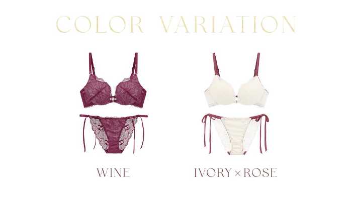 新色「ワイン」「アイボリー×ローズ」は、クリスマスにぴったりの華やかデザイン。フロントにはゴールドホック、総レースで芍薬をモチーフにした上品な装飾がポイントです。