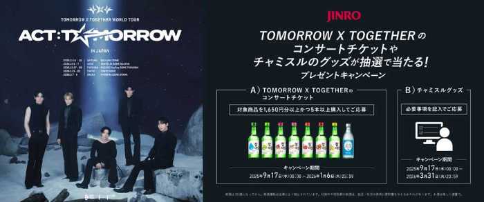 今年9月にスタートした「TOMORROW X TOGETHER×チャミスル・眞露」コラボ第1弾がSNSを中心に大きな話題となり、ついに待望の第2弾が発表されました。今回は、東京・大阪公演のチケットが当たる特別キャンペーンを新たに追加。さらに応募条件の異なるオープンキャンペーンでは、寝ころびトゥッコビフィギュアやショットグラスセットなど、ファンにはたまらない賞品も登場します♡