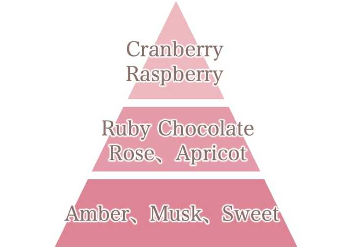 香りは、クランベリーやラズベリーのジューシーな酸味とルビーチョコレートの芳醇な甘さが溶け合い、思わずうっとりするようなときめきを演出♡